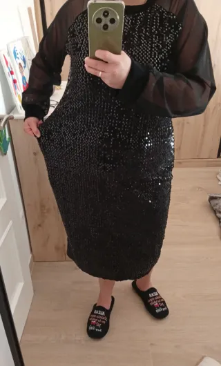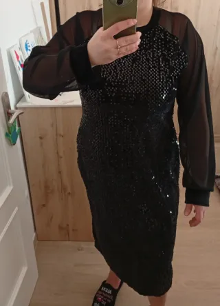Vestido elegante con lentejuelas brillantes. - Diseño con mangas largas transparentes. - Largo Sin estrenar.