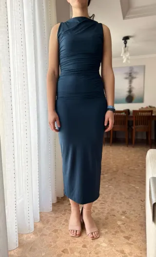 Elegante vestido largo, ideal para eventos especiales. Narca talla L pero me lo he puesto para las fotos y utilizo una M, A ESTRENAR CON ETIQUETAS PUESTAS - Diseño ajustado con drapeado. - Largo hasta el tobillo. - Escote asimétrico. - Sin mangas.