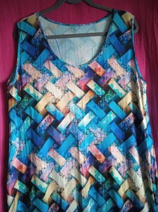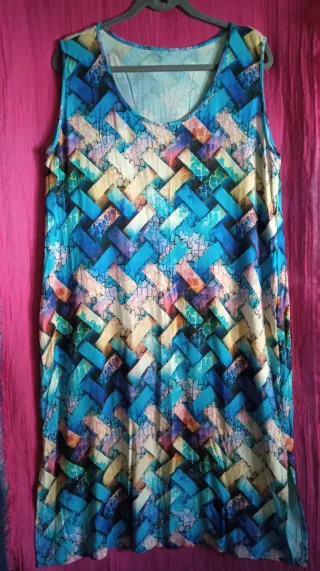 Vestido de verano con un llamativo estampado geométrico y de estilo tejido. - Diseño sin mangas. - Escote redondo. - super cómodo, es elástico.