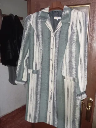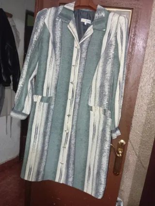 Vestido largo con un estampado vertical en tonos verdes y grises. - Diseño con cuello camisero. - Cierre de botones en la parte delantera. - Dos bolsillos en la parte superior. - Mangas largas con puños.