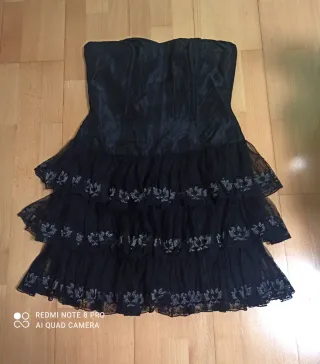 Vestido de fiesta elegante con un diseño de volantes. - Cuerpo superior tipo corsé, con varillas. - Falda con tres capas de volantes. - Adornos florales plateados en los volantes. - Cierre de cremallera en la espalda. Boda, ceremonia, celebración, invitada, evento, cóctel, fiesta, Navidad, Nochevieja...