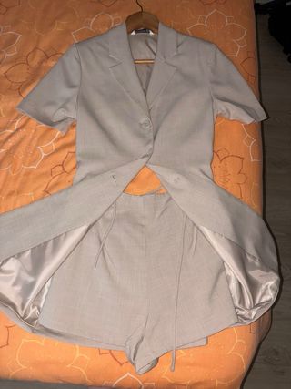 Vestido estilo blazer en color beige, con un diseño moderno y elegante. - Pantalón incluido. - Espalda descubierta con cordones. - Manga corta. - Usado solo una vez