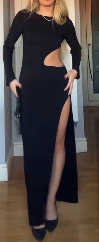 Vestido largo negro de Zara con abertura lateral. - Diseño elegante y moderno. - Manga larga. - Escote redondo. - Abertura pronunciada en la pierna.