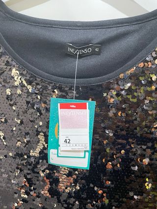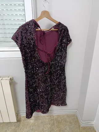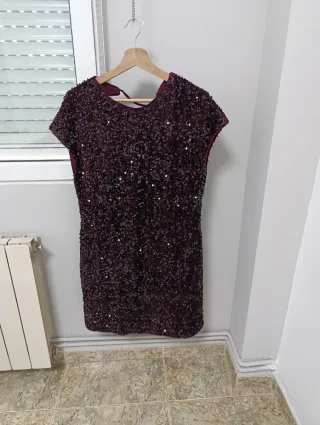 Vestido corto con lentejuelas de Mango. - Diseño con lentejuelas brillantes. - Manga corta. - Escote redondo en la espalda. Nuevo sin estrenar, ideal para nochevieja