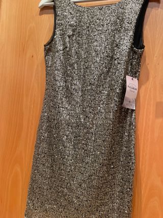 Vestido corto con lentejuelas brillantes. Escote en la espalda,practicamente nuevo. Ancho 48 y largo 82. - Diseño sin mangas. - Escote redondo. - Acabado con lentejuelas.