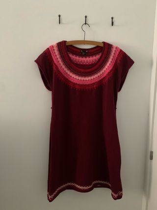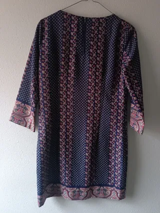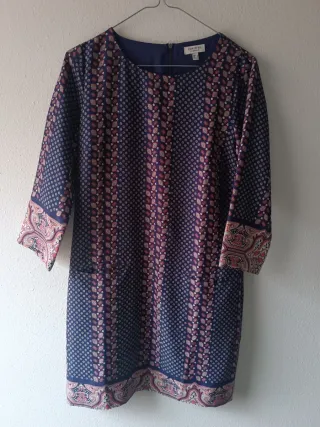 Vestido corto fluido estampado vintage. Detalle de bolsillos. Cremallera en espalda. Poco uso, en perfecto estado.