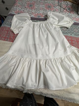 Vestido blanco con escote elástico. - Mangas abullonada. - Es un vestido en talla L pero da mucha talla perfecto para xL - Falda con vuelo.