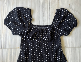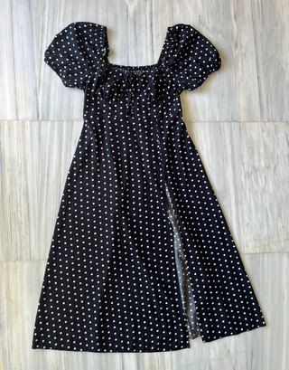 Vestido largo negro con estampado de lunares blancos. Con mangas abullonadas y escote cuadrado con detalle de fruncido y lazada. La parte trasera es elástica (tipo nido de abeja), por lo que se adapta muy bien al cuerpo. Lleva abertura lateral en la pierna. ✨ Color: negro con topos blancos ✨ Marca: Shein ✨ Talla: 2XL ✨ Medidas: contorno de cintura 94-130cm / contorno de caderas 128cm / largo 141cm / largo manga 38cm / axilas 58cm ✨ Composicion: 100% poliester