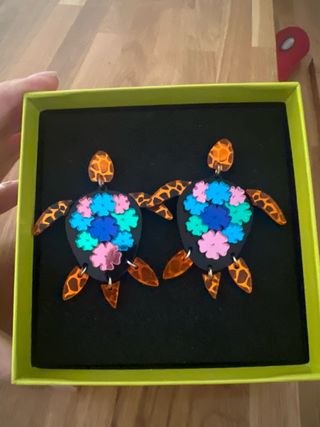 Pendientes con diseño de tortugas. - Detalle de flores en el caparazón. - Acabado con estampado de leopardo en las aletas y cabeza.