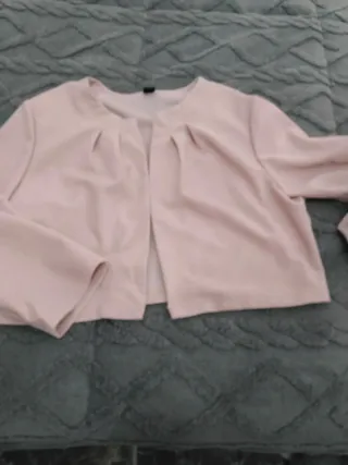 Chaqueta corta de color rosa con un diseño elegante. - Cuello redondo. - Abertura frontal. - Mangas largas. - Detalle de pliegues en la parte delantera.