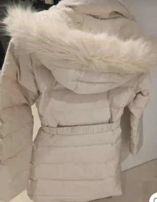 Abrigo de plumas en color crema, talla L, con etiqueta. Pelo del gorro desmontable cinturón ajustable con hebilla dorada al igual que la cremallera metálica - Diseño acolchado. - Cinturón ajustable. - Cuello con detalle de pelo.