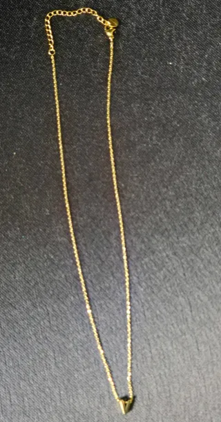 Collar dorado con un colgante en forma de V, de acero inoxidable. Medidas: 22.5 cm largo. Nuevo, en perfecto estado.