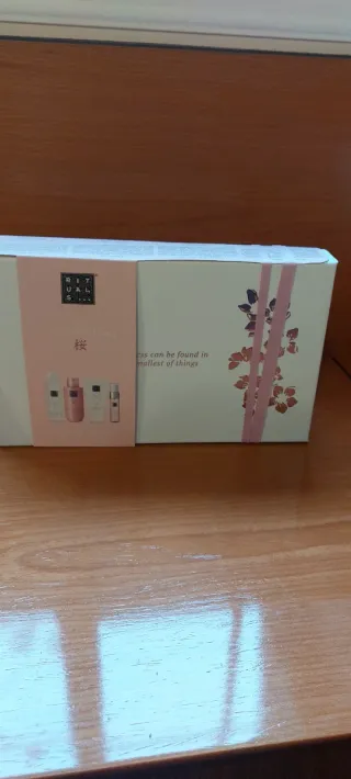 Estuche de la marca Rituals con varios productos. - Diseño con flores y cintas rosas. - Incluye varias botellas y frascos pequeños.