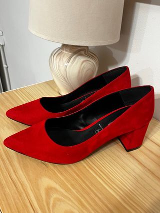 Elegantes zapatos de tacón en color rojo. Solo usados en una ocasión. Sin roturas ni manchas. - Diseño de punta fina. - Tacón grueso y estable. - Acabado tipo ante.