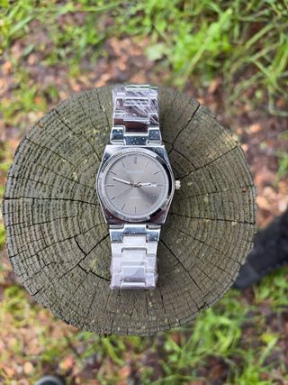Reloj de pulsera con un diseño elegante y moderno. - Correa de eslabones metálicos. - Esfera con detalles de día y fecha.
