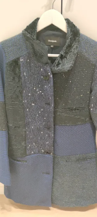 Abrigo de la marca Desigual con un diseño patchwork único. - Combinación de tejidos en azul y negro. - Cuello con detalle de pelo sintético. - Cierre de botones. - Talla 42 (XL).