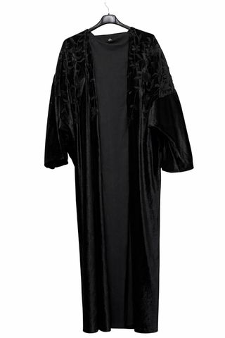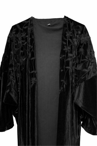 Elegante abaya negra con un delicado bordado floral. - Diseño largo y fluido. - Tejido de terciopelo suave. - Bordado detallado en mangas y parte superior.