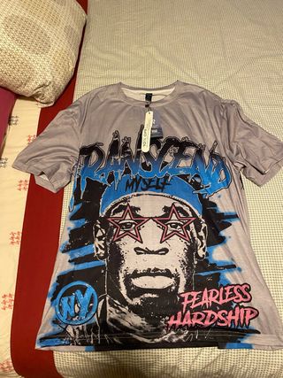 Camiseta con un diseño llamativo y moderno. - Estampado frontal con Rage y Fearless Hardship. - Gráfico de rostro con gafas de estrella. - Detalle NY en el lateral.