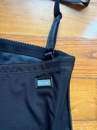Tela lisa + powerslim. Cierre invisible con 2 broches internos + 1 de seguridad. Abertura inferior, tirantes removibles termofusionados, elástico antideslizante en pierna. Control fuerte en abdomen alto, medio, bajo y espalda. Levanta glúteos. Talla M.