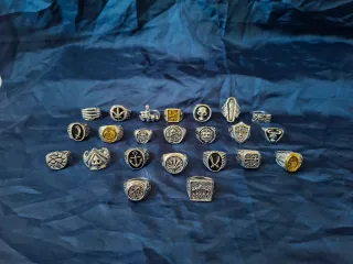 Lote de 23 anillos con diseños variados, inspirados en estilos masonicos y góticos con calavera ect... - Diseños detallados. - Acabado plateado.