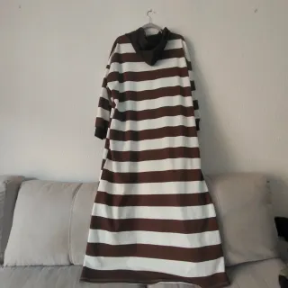 Vestido largo con un diseño de rayas horizontales en blanco y marrón. Cuenta con capucha y cordones ajustables. - Diseño de rayas. - Manga larga. - Capucha. - Cordones.