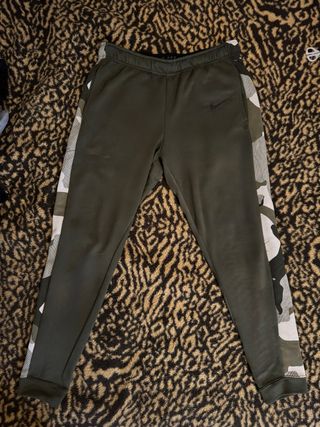 Pantalón deportivo Nike Dri-Fit en color verde oliva con detalles de camuflaje en los laterales. - Diseño moderno y funcional. - Tejido técnico para mayor comodidad.