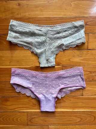 Conjunto de dos tangas de tiro bajo, uno en color beige y otro en color rosa. Ambos tienen detalles de encaje. - Tanga beige con encaje completo. - Tanga rosa con estampado de topos y encaje.
