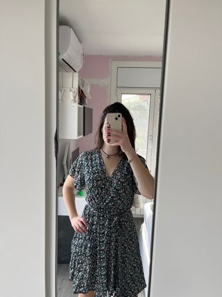 Vestido de verano con estampado floral. Ideal para días soleados. - Diseño cruzado. - Cinturón a juego. - Mangas cortas abullonadas.