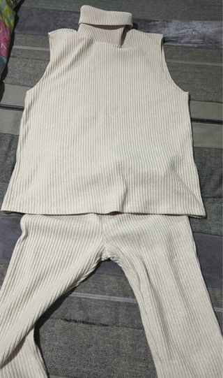 Conjunto de dos piezas de punto. - Top de cuello alto y sin mangas talla L - Pantalón acampanado talla M - Tejido de canalé. - Vendo junto o separado