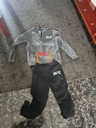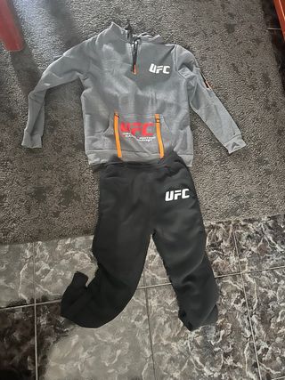 Conjunto deportivo de dos piezas con el logo de UFC. - Sudadera gris con cremallera. - Pantalón negro.