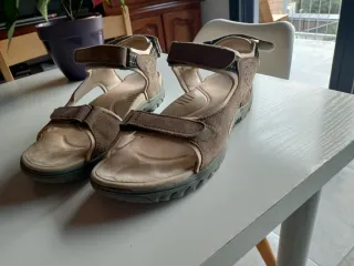 Sandalias deportivas Quechua en color beige y marrón, sin estrenar. - Cierre de velcro ajustable. - Suela de goma antideslizante. - Diseño abierto para mayor frescura.