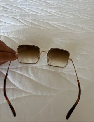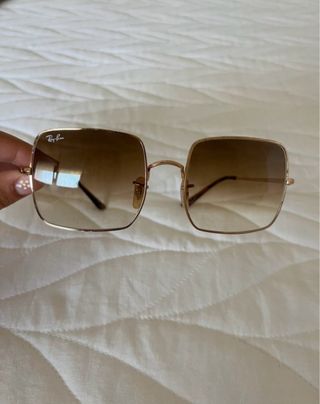 Gafas de sol Ray-Ban con un diseño cuadrado y montura dorada. - Lentes con degradado marrón. - Logo de Ray-Ban en la lente izquierda. Precio negociable