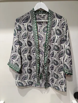 Blusa con un bonito estampado paisley en tonos verdes y morados. Es ligera y fluida, ideal para cualquier ocasión. ** Solo se usó 1 vez - Diseño con cuello en V y manga corta. - Cierre con lazada y detalle de flecos. - Ribete a cuadros en puños y delanteros.