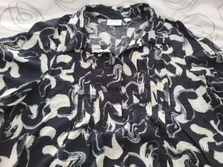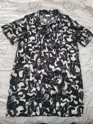 Vestido de estilo vintage con un llamativo estampado. Usado muy pocas veces, queda holgado. Me costó 55€. - Diseño de manga corta. - Detalles fruncidos en la espalda y el pecho. - Cuello camisero. - Cierre de botones. - Estampado abstracto en blanco y negro.