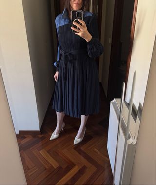 Vestido de Adolfo Dominguez con un diseño moderno y elegante. - Combinación de tonos azules. - Tejido plisado. - Cinturón a juego. - Cuello camisero.