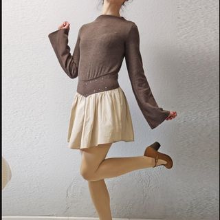 Vestido corto de cuello redondo y manga larga de color marrón y beige en talla S 36 marca Zara. Detalle de fajín en mismo tejido con aplicación de tachas. Bajo en tejido a contraste acabado en línea evasé. Visón vigoré Vestido de manga larga con combinación de tejidos y colores. La parte superior está confeccionada en un tejido marrón oscuro con textura, mientras que la parte inferior presenta un tejido beige claro, más fluido y con caída amplia. El diseño incluye un panel en forma de “V” en la cintura decorado con pequeñas tachuelas metálicas, que aporta un detalle distintivo y estiliza la silueta. Prenda cómoda, original y fácil