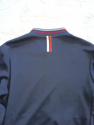Chaqueta estilo bomber de Zara en color azul. Presenta un diseño deportivo con detalles de rayas en cuello y puños. - Cierre de cremallera frontal. - Dos bolsillos laterales con cremallera. - Puños y bajo elásticos con detalle de rayas. - Excelente estado, sin manchas ni desgaste