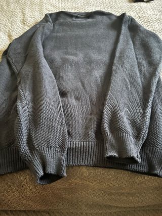 Chaqueta fina de punto con un diseño abierto y detalles calados. - Manga larga. - Cuello camisero. - Cierre de botones. - Tejido ligero. Tiene una mancha pero es minúscula, como se aprecia en la foto, es por atrás (por la parte de dentro), no se ve