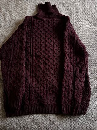 Jersey largo de punto con un diseño calado en color marrón chocolate. Presenta un cuello alto con botones. - Diseño de punto calado. - Cuello alto con detalle de botones. - Manga larga. - viene como talla S pero es pequeño, mejor para XS - casi sin usar