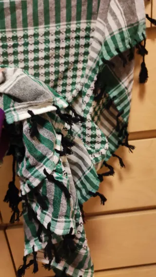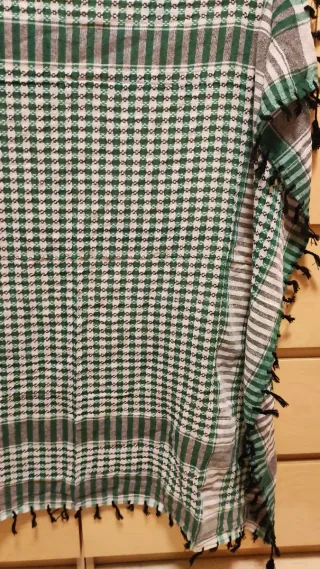 Pañuelo con diseño de cuadros y flecos. - Diseño de cuadros en verde y blanco. - Flecos en los bordes.
