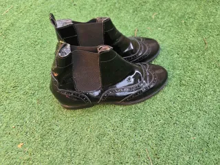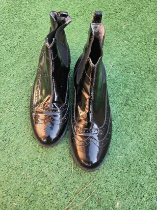 Botines de charol con diseño tipo brogue. - Acabado brillante. - Detalle de picado decorativo. - Elásticos laterales para facilitar el calce.