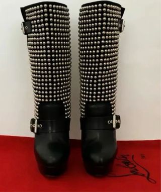 Botines de plataforma Christian Louboutin con un diseño audaz y llamativo. - Acabado en piel negra. - Detalle de tachuelas plateadas. - Hebillas metálicas decorativas. - Tacón alto de casi 12 cm y plataforma.