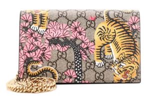 Bolso GG supreme tigre de Bengala. - Lona revestida GG Supreme en beige - Herrajes dorados - Correa de hombro desmontable de cadena - Motivo de Bengala rosa y multicolor en el exterior - Forro interior de piel a juego - Compartimento interior con cremallera -18 ranuras interiores para tarjetas Cierre a presión en la solapa frontal Medidas: • Largo (L) 7.5” → 19.05 cm • Alto (H) 4.5” → 11.43 cm • Ancho (W) 1.5” → 3.81 cm