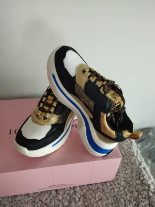 Zapatillas deportivas con un diseño moderno y llamativo. -lola casademunt - Combinación de colores negro y dorado. - Suela gruesa y cómoda. - Detalle de malla en los laterales.