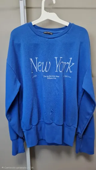 Sudadera de Stradivarius con un llamativo color azul Klein. Presenta un diseño con texto New York bordado en blanco en la parte frontal. - Cuello redondo. - Puños y bajo elásticos. - Manga larga.