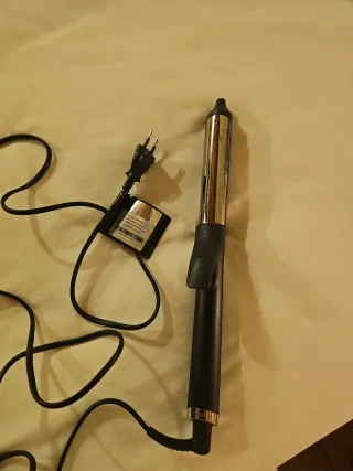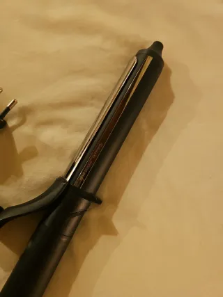 Tenacillas para el pelo de la marca GHD. - Barril plateado brillante. - Mango de color negro. - Cable de alimentación.
