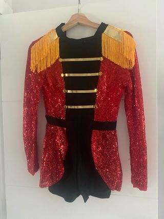 Disfraz de inspiración circense, ideal para eventos o fiestas. - Diseño con lentejuelas rojas brillantes. - Detalles en negro y adornos dorados. - Mangas largas. -Alguna lentejuela esta deshilada pero el disfraz esta en muy buen estado.