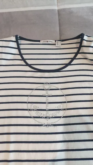 Camiseta de manga corta de la marca Punto Roma, con un diseño de rayas clásico y un detalle de ancla en la parte delantera, está en buen estado - Talla - G - Diseño de rayas horizontales. - Adorno de ancla con pedrería en el pecho. - Cuello redondo. - Manga corta.