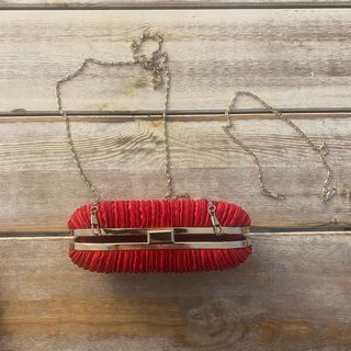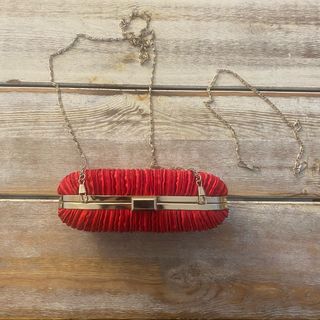 Precioso bolso de mano tipo clutch en color rojo intenso con elegante acabado plisado. Ideal para bodas, comuniones o eventos de noche. • Estado: Impecable / Como nuevo. • Medidas: 18 cm (largo) x 9 cm (alto) x 6 cm (ancho). • Versatilidad: Incluye cadena dorada extraíble para llevarlo al hombro o tipo bandolera. Cierre metálico de clic muy seguro. • Capacidad: Cabe perfectamente el móvil, llaves y maquillaje.