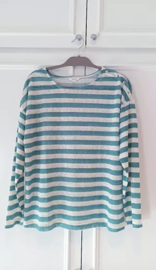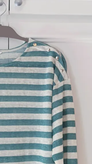Jersey de manga larga de la marca Springfield, diseño de rayas horizontales en tonos verde azulado y blancos. Presenta detalles de botones plateados en los hombros. Talla -L